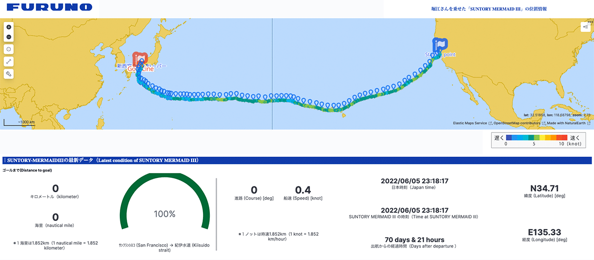 堀江さんを乗せた愛艇「サントリーマーメイドIII号」をリアルタイムに追尾し、艇の位置情報を定期的に表⽰していました。